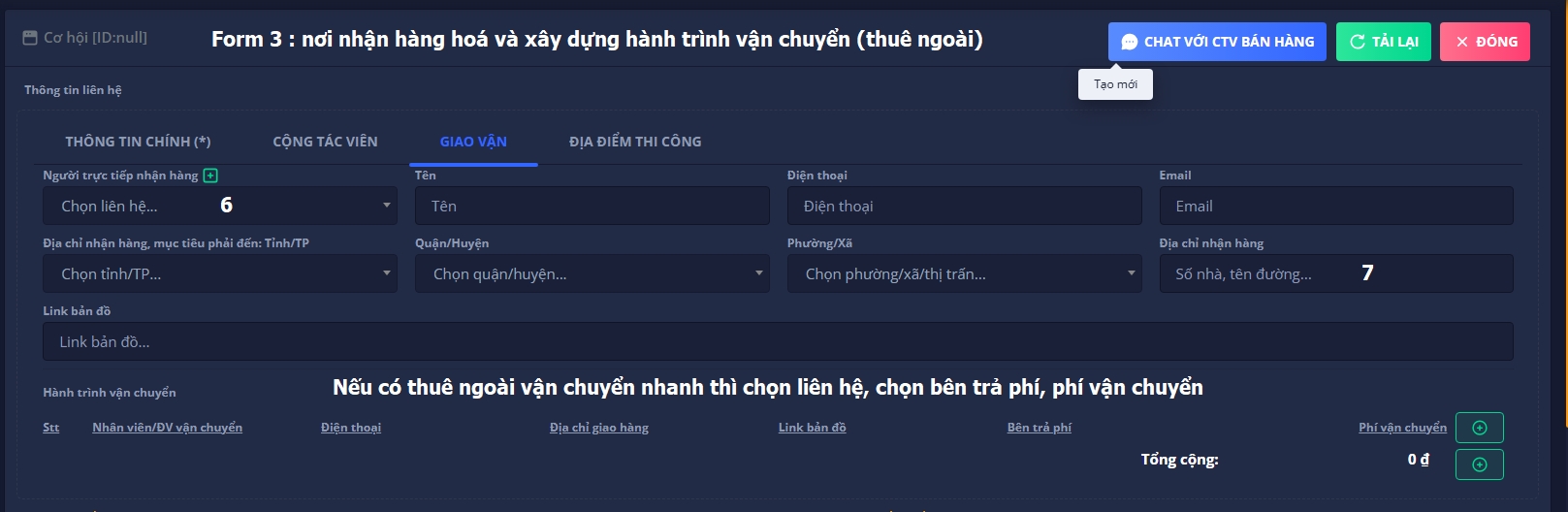 Hành trình vận chuyển: Nếu có thuê ngoài, chọn đơn vị vận chuyển và phí.